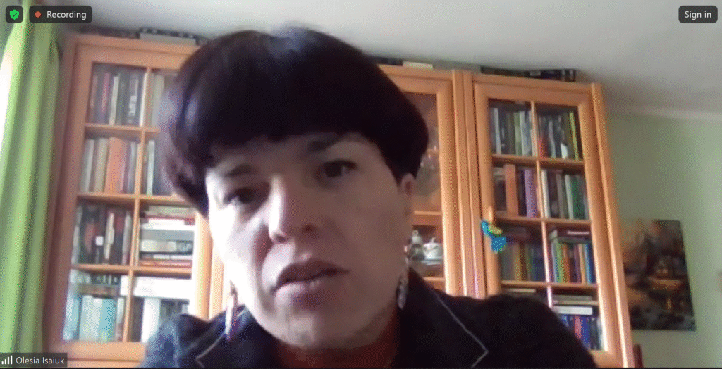 Темою онлайн-зустріч стало «Долання тоталітаризму: український досвід через призму фантастичного жанру». Олеся Ісаюк, доктор гуманітарних наук, співробітниця НММ «Тюрма на Лонцького» і Центру досліджень визвольного руху підкреслила переваги української соціальної фантастики щодо осмислення національних травм у порівнянні з історичною белетристикою. На її думку, сучасна історична проза зосереджується переважно на темі колоніалізму та має певні свої обмеження й вимоги щодо відповідності епосі. Натомість фантастичний жанр, який потужно розвивається в Україні, не настільки скутий деталями, але забезпечує необхідну дистанцію для розгляду травми геноциду, імперськості й тоталітаризму. Олеся Ісаюк звернула увагу на потребу «проговорити» ті болючі теми, які українці відкладають у поколіннях. І це не лише тема владного насилля, що застосовувалось як комуністичним, так і нацистським режимом, а й проблеми соціальної/національної мімікрії, втручання тоталітаризму в особисте життя, конфлікту між особистістю й пропагандою, між ідеологією та етикою. Олеся Ісаюк закцентувала на тому, що в умовах тоталітарної системи є три елементи, які забезпечують людині виживання: наявність власної картини світу, мета існування, навіть ірраціональна й романтична, та референтна група, яка поділятиме цінності й підтримуватиме.