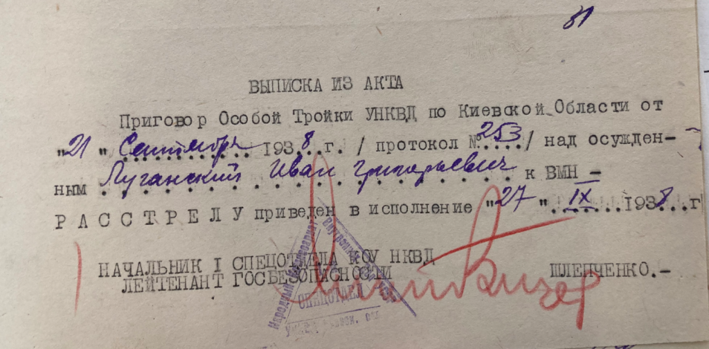 Остаточне рішення щодо справи Івана Луганського ухвалила трійка УНКВС по Київській області. Розстріляли чоловіка 27 вересня 1938 року. Процес реабілітації Івана Луганського було розпочато в 1989 році. Офіційне підґрунтя для перегляду справи становила ст. 1 Указу Президіуму Верховної Ради СРСР від 16 січня 1989 року «Про додаткові міри з відновлення справедливості у відношенні жертв репресій, що мали місце в період 30-40-х і початку 50-х років». Остаточне рішення про реабілітацію ухвалено в квітні 1989 року.