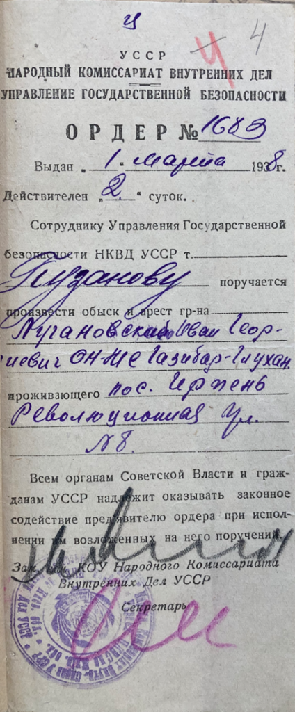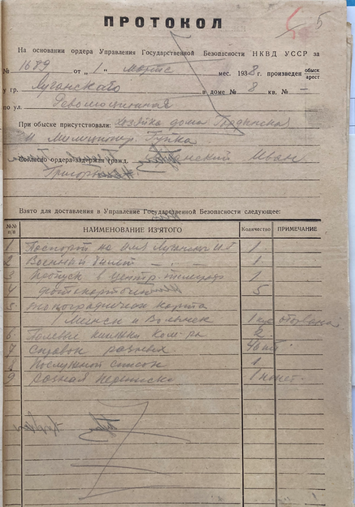 1 березня 1938 року співробітники НКВС арештували І. Луганського й обшукали його помешкання, вилучивши паспорт, військовий квиток, перепустку, фотокартки, топографічні карти, різні довідки та листування.