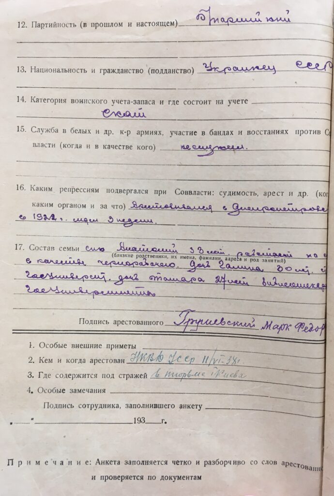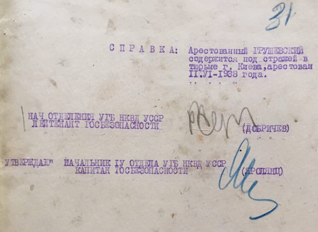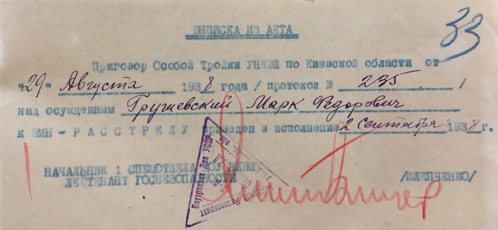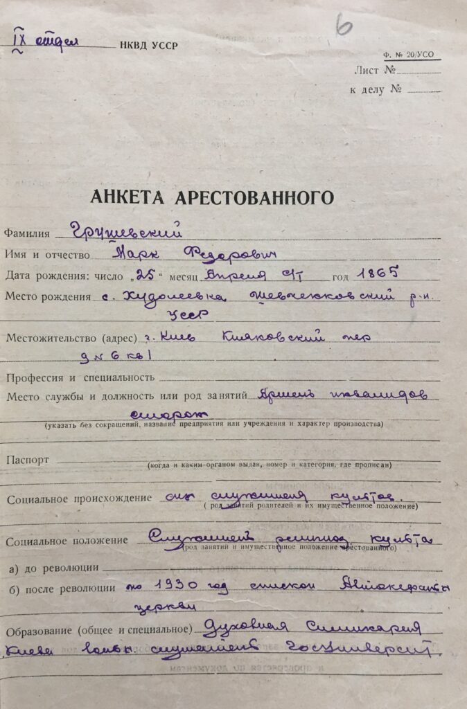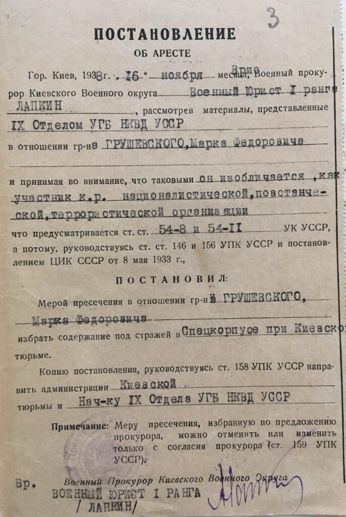 11 червня 1938 р. оперуповноважений 9 відділу УГБ НКВД УССР П. Веретєнніков ухвалив постанову про арешт священника Марка Федоровича Грушевського. Його обвинувачували як «учасника контрреволюційної, повстанської і терористичної організації» й інкримінували ст. 54-8 (вчинення терористичних актів) і 54-11 (організаційна діяльність для вчинення контрреволюційного злочину) Кримінального кодексу УССР. У той же день був підписаний ордер про його арешт і обшук. Помешкання по Киянівському провулку, 6 обшукували два співробітники НКВД УССР Беркун і Бривко. Вони вилучили приватне листування, паспорт, ощадну книжку, де зберігалося 5 руб., два футляри для окулярів, годинник та хрест білого металу. Вже підслідного М. Грушевського відвезли до спецкорпусу Київської в’язниці.