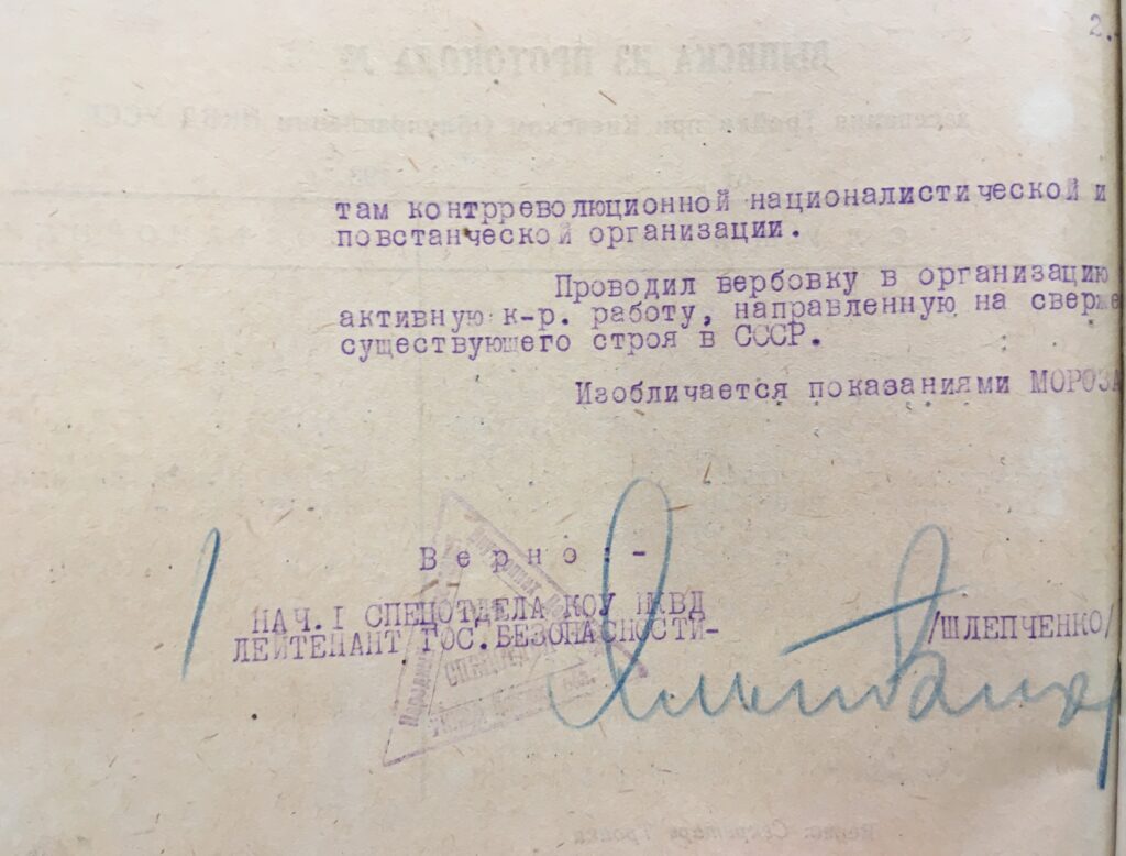 Обвинувальний вирок без дати, що також свідчить про попередню підготовленість, був затверджений начальником 4 відділу УГБ НКВД УССР Алєксандром Яралянцем.