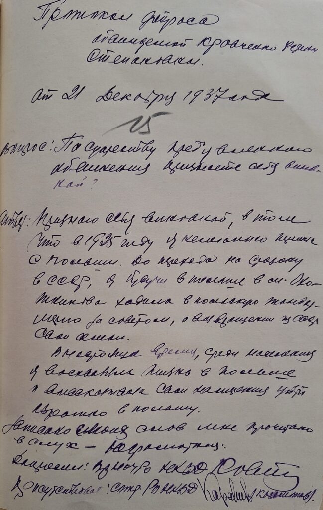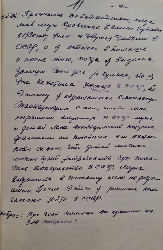 В архівно-кримінальній справі зафіксовані два протоколи допитів підслідної. Під час першого, датованого 16 грудня 1937 р., Юстина Степанівна частково визнала свою провину, зокрема розповіла про свою «контрреволюційну діяльність», яка нібито полягала у поширенні висловлювань, що вихваляли життя «фашистської Польщі», зводили наклеп на радянську владута провокували незадоволення шляхом порівняння умов життя в СРСР і Польщі на користь останньої. У протоколі зафіксовані її слова: «Ми тут страждаємо, а в Польщі моя донька гарно живе, там нема колгоспів і люди всі гарно живуть».