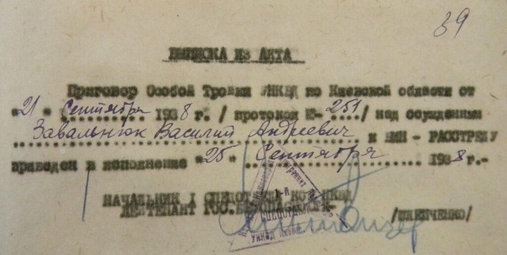 21 вересня 1938 р. (протокол № 251) трійка при УНКВС по Київській області засудила Василя Андрійовича до розстрілу із конфіскацією майна. Вирок виконали у Києві 25.09.1938 р.