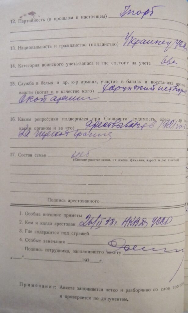 У постанові від 28 лютого 1938 р. зазначено причини, через які радянські спецслужби зацікавились чоловіком: «приховує перебування у петлюрівській армії, разом із армією УНР евакуювався до Польщі та у 1922 році був перекинутий до СРСР, підозрюється у шпигунській діяльності», тобто йому інкримінували злочини, передбачені ст.ст. 54-6 та 54-11 КК УРСР. Мірою запобіжного заходу обрано тримання під вартою у спецкорпусі Київської в’язниці.