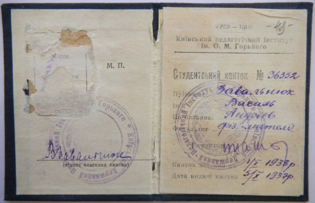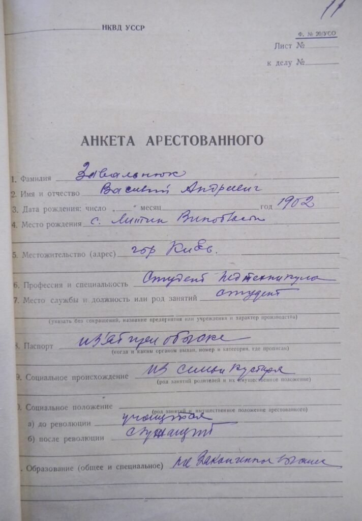 Василя Андрійовича обшукали кілька разів – особисто й за місцем проживання. При особистому обшуку 26 лютого 1938 р. вилучили кишеньковий годинник, паспорт, студентський квиток, ручку, блокноти із записами. При обшуку 28 лютого 1938 р. за місцем мешкання по вул. Жадановського (нині – Жилянська), 81, кв. 2 вилучено: чистий бланк зі штампом і печаткою Ківшоватської семирічної трудової школи, військовий квиток, довідки від різних установ, членські квитки МОПРу (скорочення від рос. «Международная организация помощи борцам революции»), ОЗЕТу (скорочення від рос. «Общество землеустройства еврейских трудящихся»), ОСОАВИАХИМу (скорочення від рос. «Общество содействия обороне, авиационному и химическому строительству»), школи «Знання», кооперативу, фотокартки Завальнюка В.А., різне листування та адреси, 150 руб.
