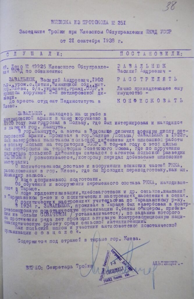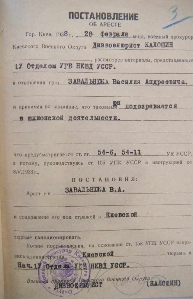 Фальсифікація кримінальних справ арештованих у часи Великого терору відбувалась у різний спосіб. Зокрема, частими були випадки, коли процесуальні документи виписувались «заднім числом». Так, Василя Завальнюка було заарештовано органами НКВС УРСР 26 лютого 1938 р. за два дні до офіційного винесення постанови про арешт та ордера на обшук.