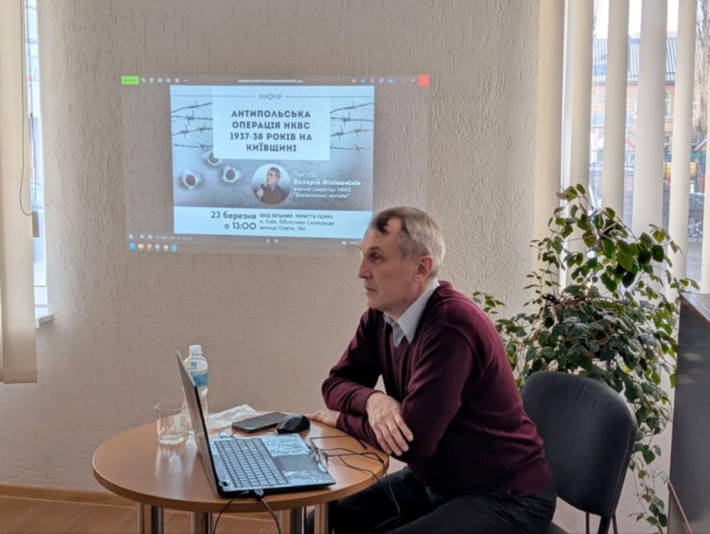 23 березня 2026 року в приміщенні Центральної районної бібліотеки ім. Г. С. Сковороди відбулась лекція вченого секретаря Національного історико-меморіального заповідника «Биківнянські могили» Валерія Філімоніхіна – «Антипольська операція НКВС 1937–1938 років на Київщині». На лекції були присутні керівництво бібліотеки та зацікавлені читачі.